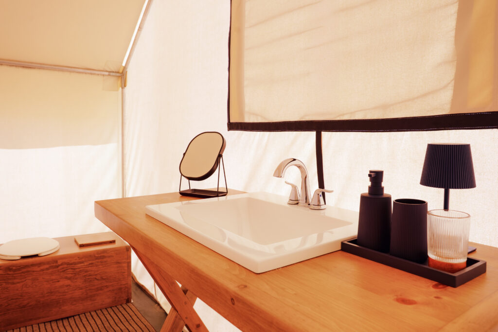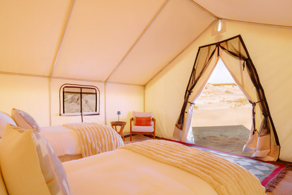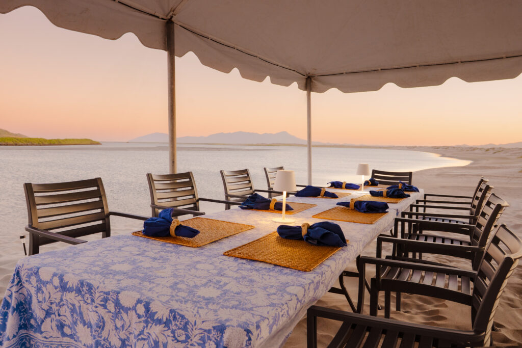 The tents of Camp Cecil de la Bahia are beautifully appointed walk-in safari-style tents with gorgeous beds, seating areas, rugs, chandeliers, and en-suite bathrooms. The camp chef prepares three beautiful meals a day and daily happy hour.