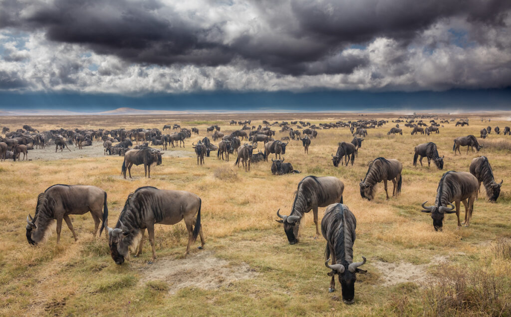 In January, the vast short-grass plains of the southern Serengeti—technically part of the greater Ngorongoro Conservation Area—become the stage for one of Africa’s most powerful wildlife spectacles: the calving season of the Great Migration. More than half a million wildebeest converge here to give birth, flooding the landscape with life and attracting a full cast of predators in their wake.